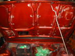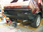 | Motorhaube vom Unterbodenschutz befreit, den ein Vorbesitzer großzügig aufgebracht hatte: | Als erstes wurde ein Schriftzug montiert, damit man nicht vergißt, WAS man hier wieder zusammenbaut: | Stoßstangen und Kotflügelverbreiterungen lackiert: | |